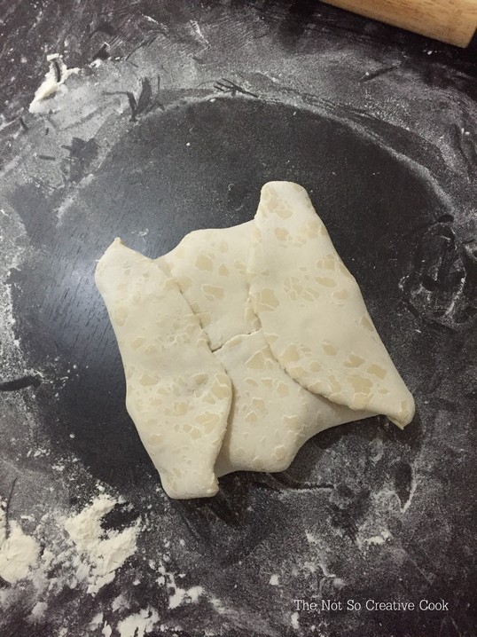 - Take out the dough from the towel and place it on your work surface dusted with all-purpose flour. Using a rolling pin, flatten the dough to a 10 inch square, making sure to lightly flour the dough when needed to avoid sticking.